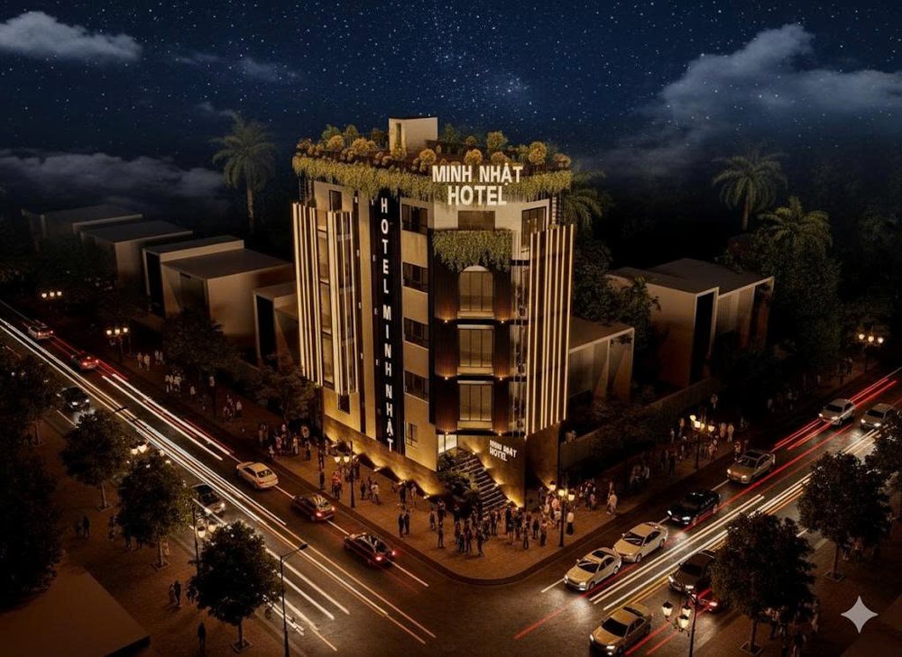 Công trình khách sạn Minh Nhật có diện tích 1000m², được thiết kế với phong cách hiện đại pha lãng mạn. Mặt tiền ốp lam đứng màu vàng ánh kim kết hợp cùng hệ thống đèn LED chạy dọc tạo hiệu ứng thị giác mạnh mẽ, khiến khách sạn nổi bật giữa con phố đông đúc.