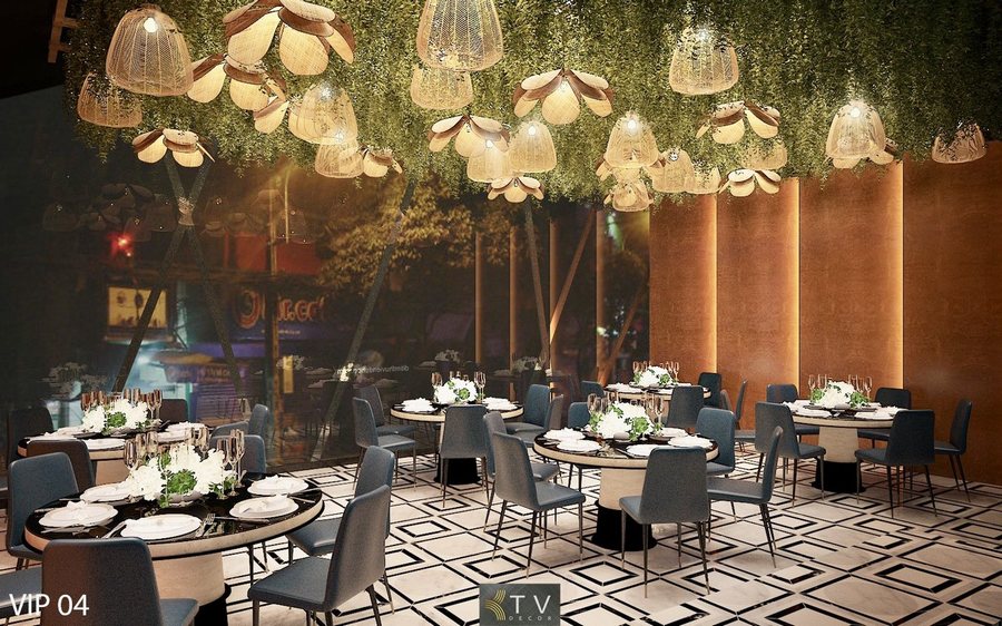 Concept thiết kế: “Green Ceiling Experience” – đưa dải cây xanh mô phỏng khu vườn treo lên trần, kết hợp ánh sáng vàng ấm từ đèn mây tre đan Việt Nam, tạo cảm giác dễ chịu – sang trọng.