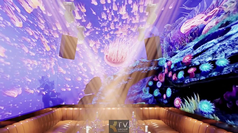 Thiết kế phòng Karaoke VIP Concept linh hoạt Full LED 5D tại TP.HCM sử dụng hình ảnh đại dương sinh động, ánh sáng đổi màu thông minh, tạo không gian giải trí cuốn hút, nâng cao trải nghiệm khách hàng và hiệu quả đầu tư.