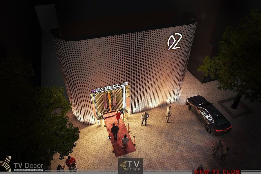 Không gian mặt tiền NEW 92 CLUB gây ấn tượng mạnh với phong cách thiết kế hiện đại, sang trọng và đẳng cấp. KTV DECOR đã khéo léo sử dụng kiến trúc mặt cong ốp lưới kim loại ánh bạc tạo hiệu ứng thị giác độc đáo, giúp công trình nổi bật cả ngày lẫn đêm. Lối vào được thiết kế thảm đỏ kết hợp dải đèn spotlight hai bên, tái hiện không khí xa hoa của các sự kiện VIP, thu hút mọi ánh nhìn từ xa.
