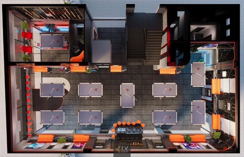 Thiết kế tầng lầu sang trọng với bố trí bàn bida chuyên nghiệp, khu lounge thư giãn, quầy bar trung tâm và hệ thống đèn trần hiện đại – nâng tầm không gian giải trí đẳng cấp.