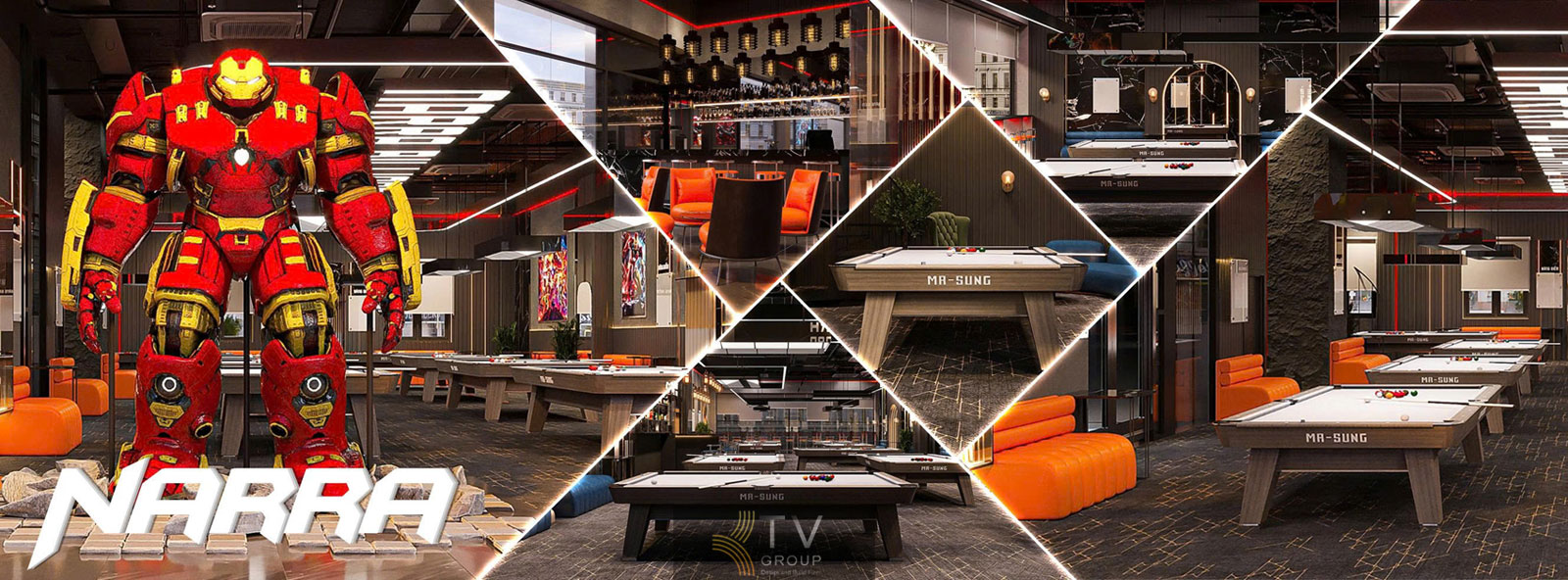 Tầng trệt NARRA BILLIARD CLUB – Không gian vào sảnh ấn tượng, kết hợp bàn MA-SUNG chuẩn thi đấu, bar lounge và tượng Hulkbuster hút mắt.