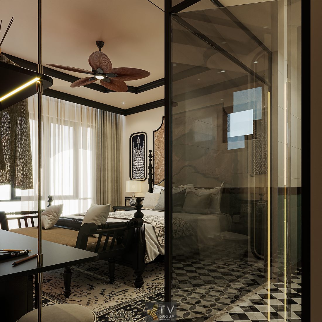 Không gian trong hình là một mẫu phòng khách sạn mang đậm dấu ấn Indochine (Đông Dương) kết hợp hiện đại, tạo nên trải nghiệm vừa hoài cổ vừa sang trọng. Thiết kế hướng đến nhóm khách hàng yêu thích sự tinh tế, riêng tư và có gu thẩm mỹ cao. Đây là một hướng đi thông minh trong mô hình khách sạn concept, giúp tạo khác biệt rõ ràng so với các không gian đại trà.