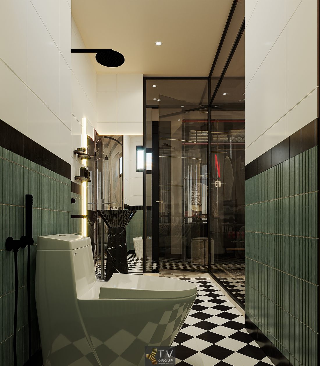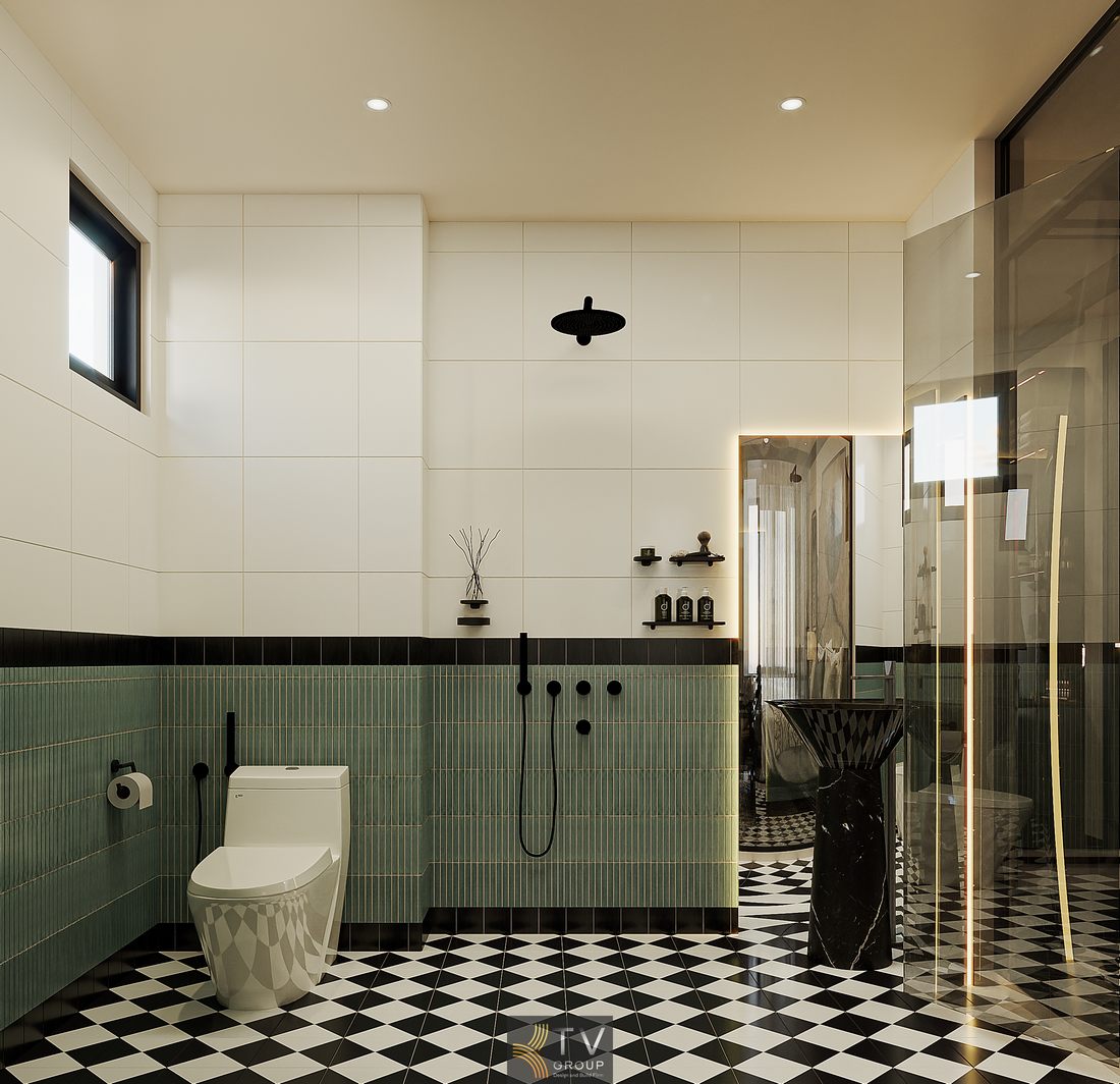 Phòng tắm sử dụng vách kính trong suốt, giúp kết nối không gian và tăng chiều sâu thị giác. Bên trong bố trí gọn gàng, hiện đại.