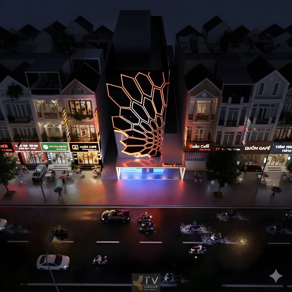 Mặt tiền được thiết kế như một “biểu tượng ánh sáng” với cấu trúc đa giác xếp lớp, tạo cảm giác vươn cao – thu hút ánh nhìn từ xa. Hệ LED đổi màu kết hợp vật liệu kim loại sơn tĩnh điện mang lại hiệu ứng thị giác cao cấp, phù hợp mô hình KTV kết hợp Bistro hướng đến tệp khách trẻ, thích trải nghiệm và check-in.